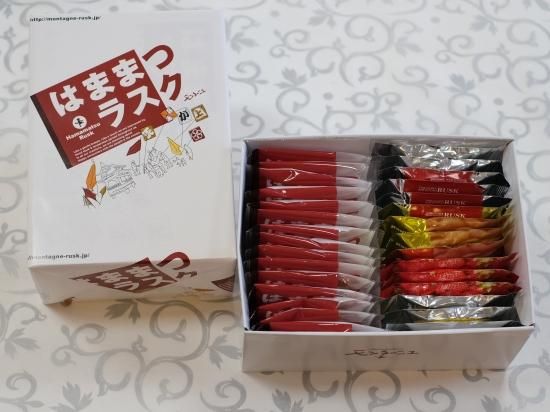 プレーンラスク25枚、緑茶ラスク3枚、ごまラスク3枚、アーモンドラスク3枚、浜納豆味噌ラスク3枚、いちごラスク3枚、うなぎいもラスク3枚、三ケ日みかんラスク3枚、珈琲ラスク2枚、ブルーベリーラスク2枚